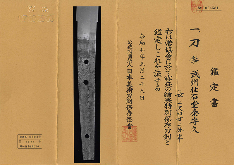 Attestato di Spada Straordinariamente Degna di Conservazione (Tokubetsu Hozon Token) rilasciata dalla Società per la Conservazione della Spada Giapponese (NBTHK)